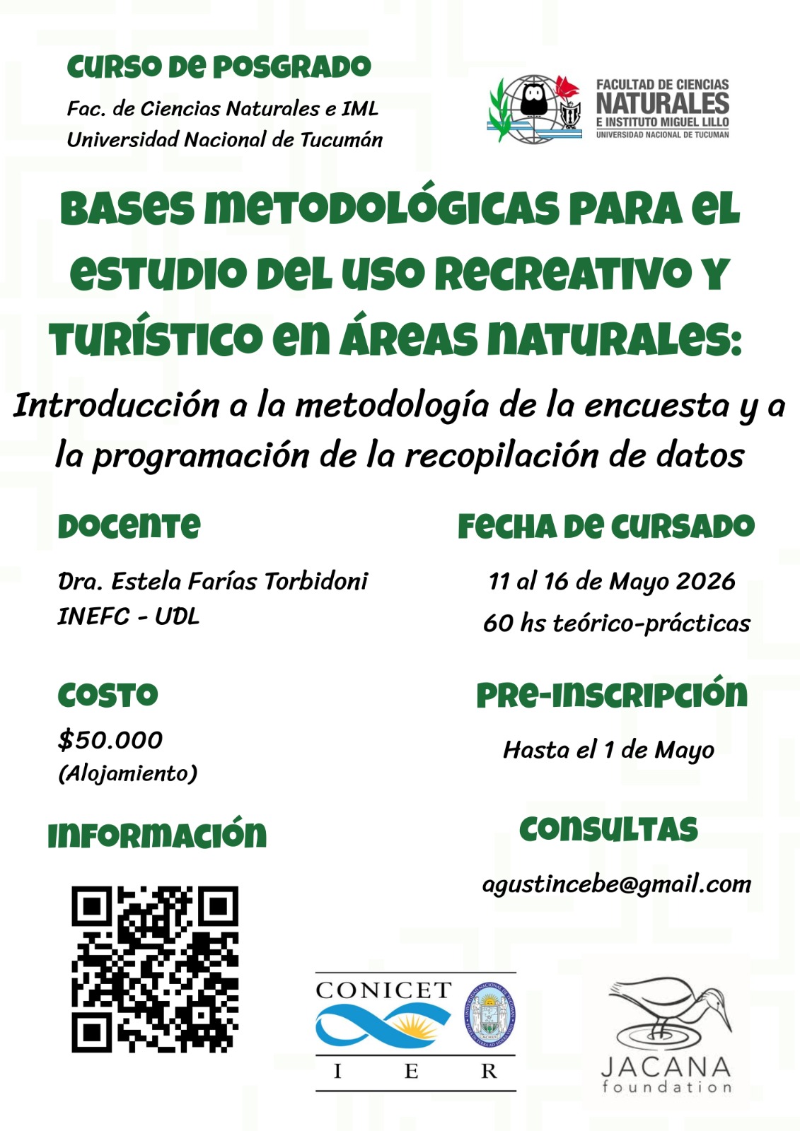 La Facultad de Ciencias Naturales e Instituto Miguel Lillo de la Universidad Nacional de Tucumán invita a participar del curso de posgrado “Bases metodológicas para el estudio del uso recreativo y turístico en áreas naturales: Introducción a la metodología de la encuesta y a la programación de la recopilación de datos”.
