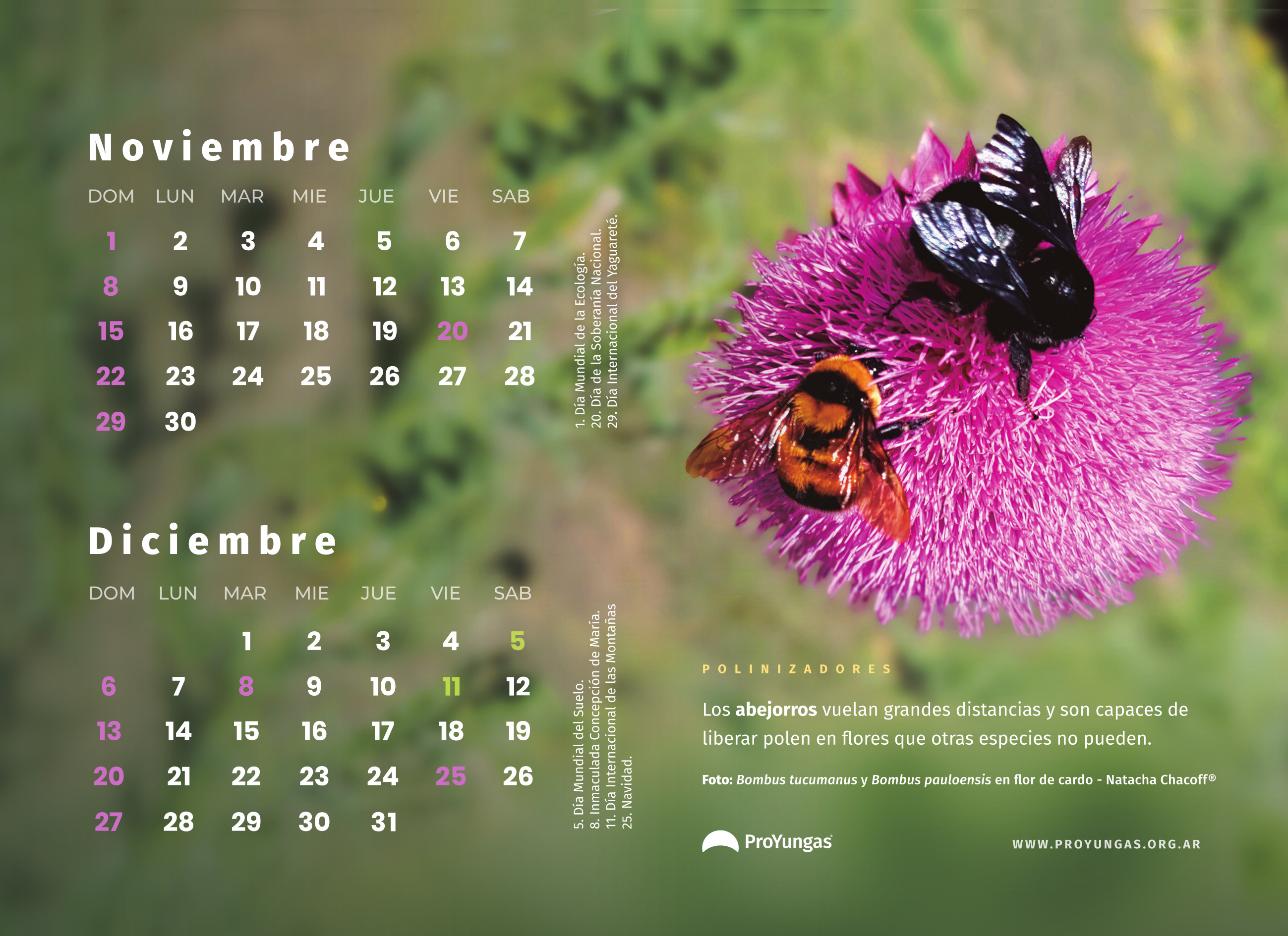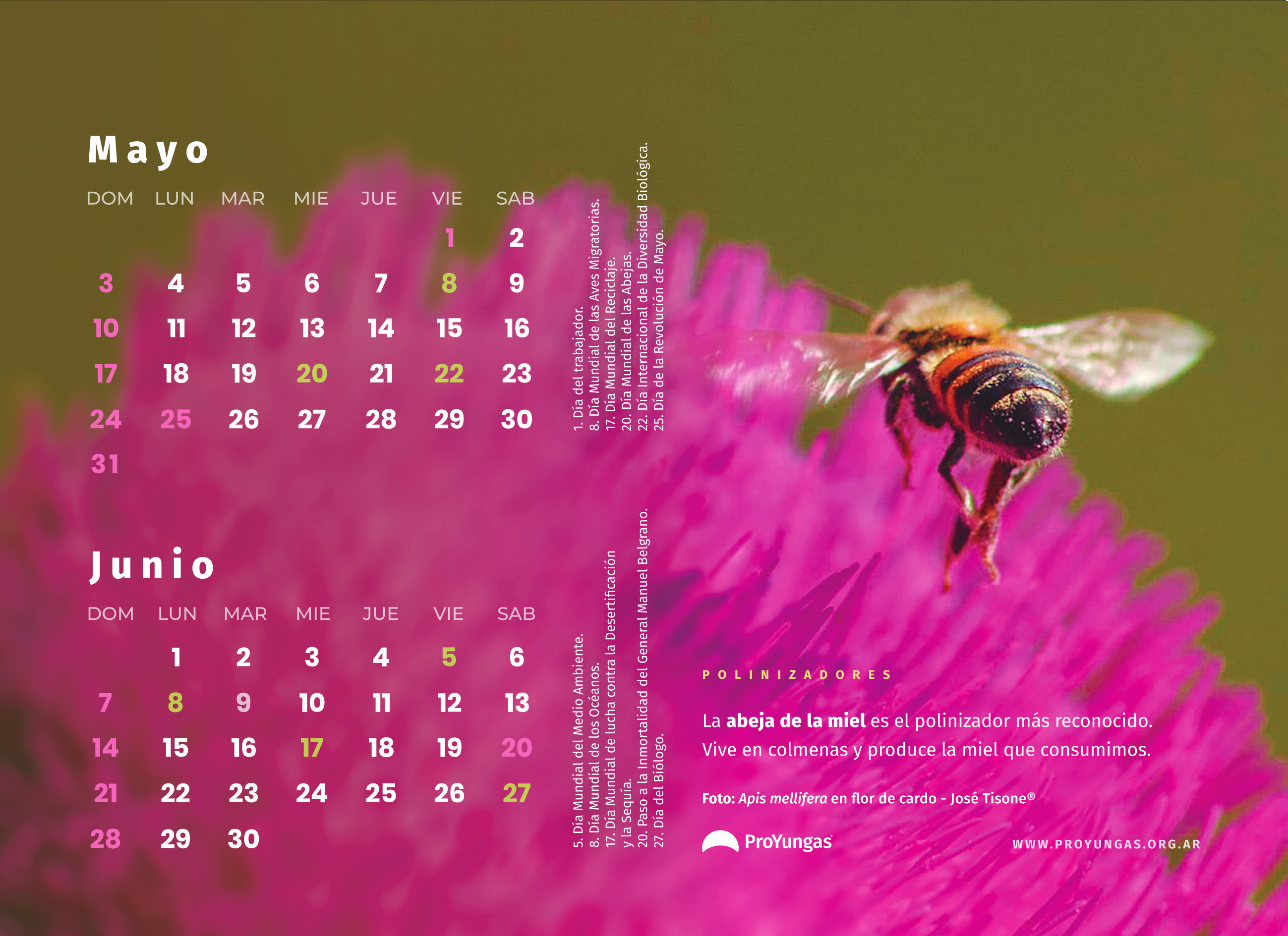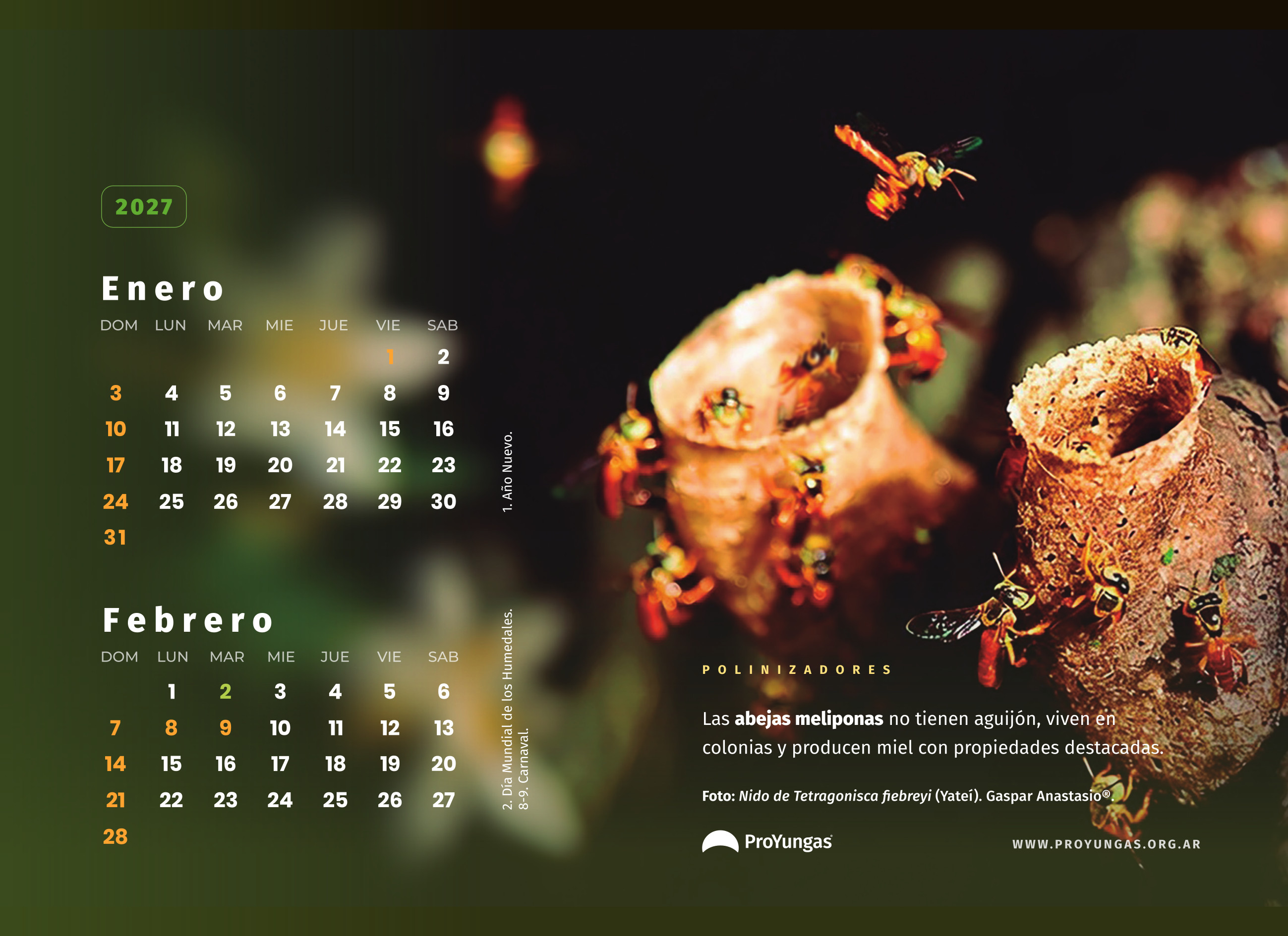 Hoy les presentamos el calendario 2026 Polinizadores del Noroeste Argentino, coeditado por la Fundación ProYungas y el IER, no solo organiza nuestros días, sino que también abre una ventana colorida y educativa al mundo de estos organismos clave. Cada bimestre pone en primer plano a un grupo diferente de polinizadores, incluyendo abejas meliponas, mariposas y picaflores, junto a especies emblemáticas como la clásica Apis mellifera y los imponentes Bombus nativos —entre ellos B. tucumanus— documentados en flor de cardo.