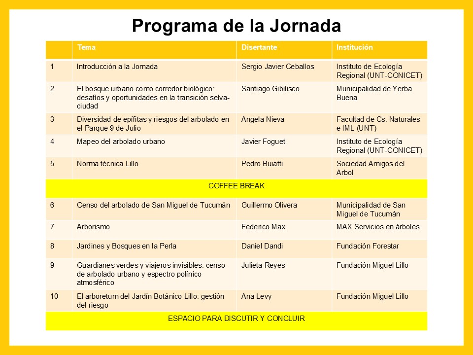 El jueves 30 de octubre se realizó en la Fundación Miguel Lillo la jornada “Conectando ciencia, educación y gestión: el arbolado urbano de Tucumán”. El encuentro fue coordinado por el Dr. Sergio Javier Ceballos, la Lic. Ana Levy y la Mag. Ángela Nieva, y coorganizado entre el Instituto de Ecología Regional, el Jardín Botánico de la Fundación Miguel Lillo, la Sociedad Amigos del Árbol, con apoyo del Global Land Programme. La iniciativa surgió ante la escasez de espacios de intercambio de información y experiencias sobre arbolado urbano en la provincia. Su objetivo principal fue reunir a actores de distintos ámbitos —investigación, gestión y educación— que trabajan vinculados a esta temática. Durante la jornada se presentaron nueve exposiciones que abordaron una amplia variedad de temas: la plantación y el manejo del arbolado urbano, la evaluación de riesgos, la presencia de epífitas, los censos de arbolado, el arborismo y las podas, además del mapeo mediante imágenes satelitales, entre otros. Asistieron más de 40 personas, conformando un público diverso que incluyó representantes de municipalidades (San Miguel de Tucumán, Yerba Buena y Bella Vista), la Dirección de Flora y Fauna, la Fundación Forestar, la Sociedad Amigos del Árbol, arboristas y viveristas, además de integrantes de instituciones científicas (IER, INTEPH, Fundación Miguel Lillo) y docentes y estudiantes de facultades (Ciencias Naturales y Agronomía). El balance del encuentro fue altamente positivo: se generaron numerosas preguntas, intercambios y debates que reflejaron un profundo interés por la temática. Celebramos la generación de este espacio de diálogo entre personas e instituciones que, aunque desarrollan sus tareas en distintos ámbitos, comparten un mismo propósito: aportar a mejorar el arbolado en Tucumán. Deseamos que esta jornada sea la primera de muchas instancias que sigan reuniendo a quienes investigan, gestionan, enseñan y cuidan el arbolado urbano en nuestra provincia.